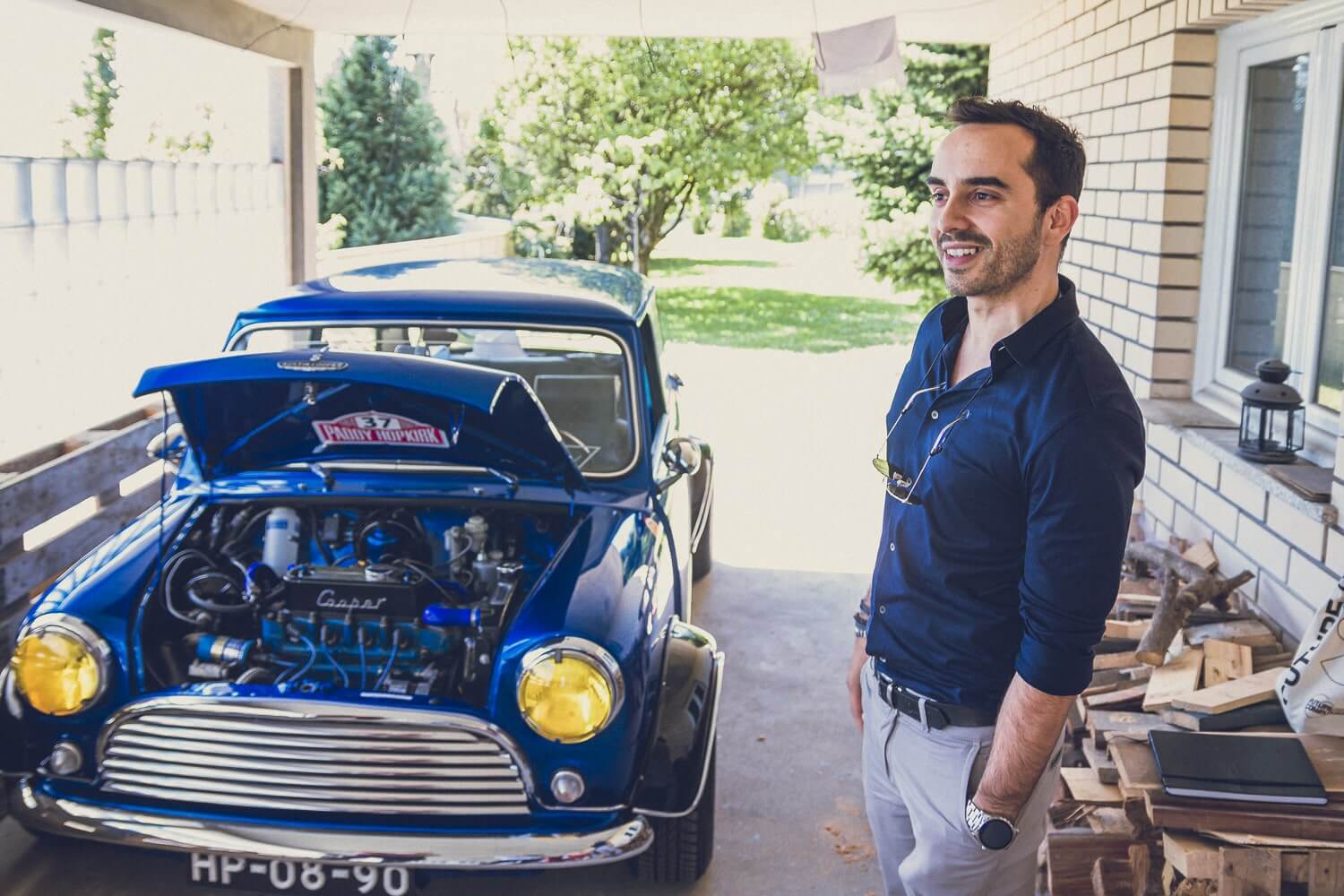 Desde os meus 10 anos que sempre me lembro de pensar em carros e sonhar com carros. Eu sempre vivi com a ansiedade de fazer 18 anos para poder ter carta de condução. Só que na altura em que tirei a carta estava a estudar e não tinha dinheiro para ter carro. Lá convenci os meus pais e eles ofereceram-me um Mini. E como tinha um Mini escolhido por mim, meti na cabeça que o tinha de o restaurar e pô-lo mesmo ao meu gosto. A questão é que nessa altura estava a fazer o Mestrado – que é bastante exigente – não tinha emprego, não tinha como ganhar dinheiro e não ia pedir aos meus pais dinheiro para restaurar um carro… Então foi aí que comecei a trabalhar no catering para conseguir ganhar dinheiro e acabava por derretê-lo todo em ferro velho (risos) – era o que os meus pais diziam. A partir daí, comecei a restaurar o Mini, a conhecer pessoas que faziam o mesmo e que me transmitiram muito conhecimento. E isso foi quase uma fonte de inspiração para aprender a gerir um projeto, lidar com pessoas, gerir prioridades… Até a comprar e vender peças, porque só com alguma experiência é que começas a perceber se é ou não a melhor escolha.
