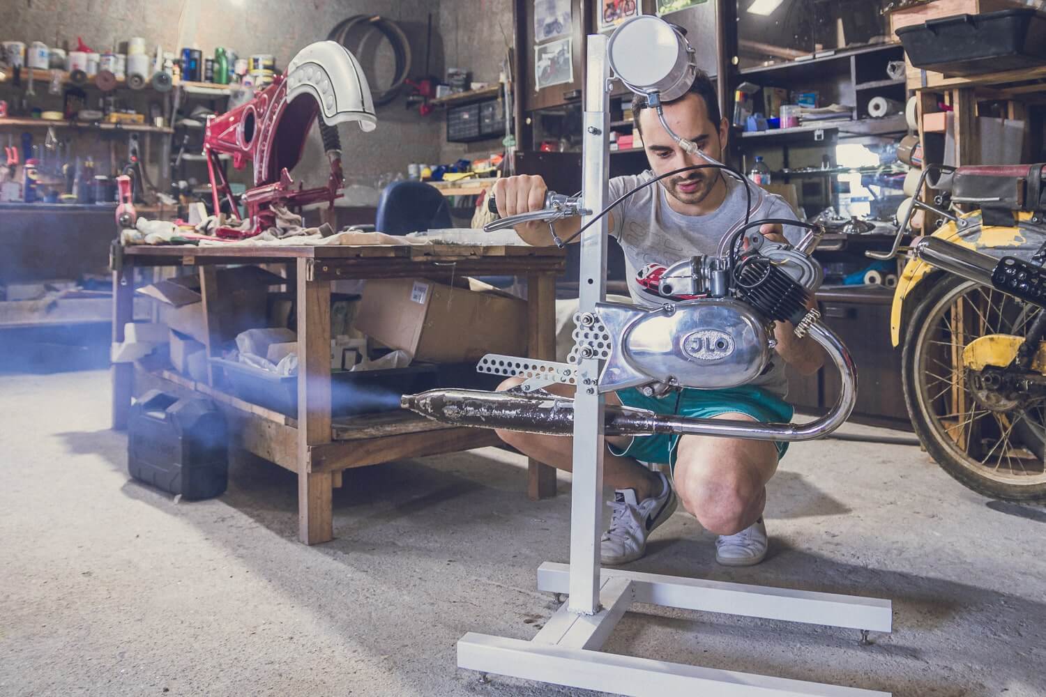 A primeira coisa é fazer o levantamento de tudo o que vai ser preciso para fazer o orçamento do projeto. A fase seguinte é a desmontagem, que é onde começas a sentir as diferenças da teoria para a prática – aquilo que pensavas que não fazia falta, afinal faz e vice-versa. Começas logo a sentir o orçamento a derrapar (risos). O terceiro passo é todo o processo de recuperação: recuperar peças, decapar o ferro velho, remover a tinta antiga, restaurar a chapa… Isto consome muito tempo! Depois tem a fase de montagem – que também te traz muitos desafios. No final, é só afinar e desfrutar. E começas logo a pensar na próxima (risos).