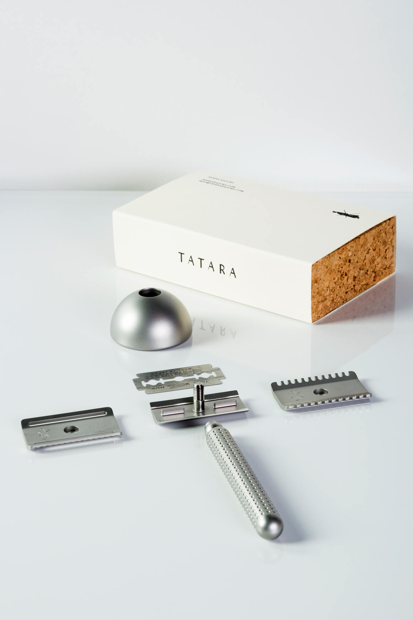 Tatara Razors machines, packed in a natural cork box, are created with noble materials such as stainless steel. The products are hand finished to extinguish every machining marks and to soften all the edges and, finally, they are subject to manual sandblasting treatment, piece by piece, to obtain a matte colouring and a smooth appearance.