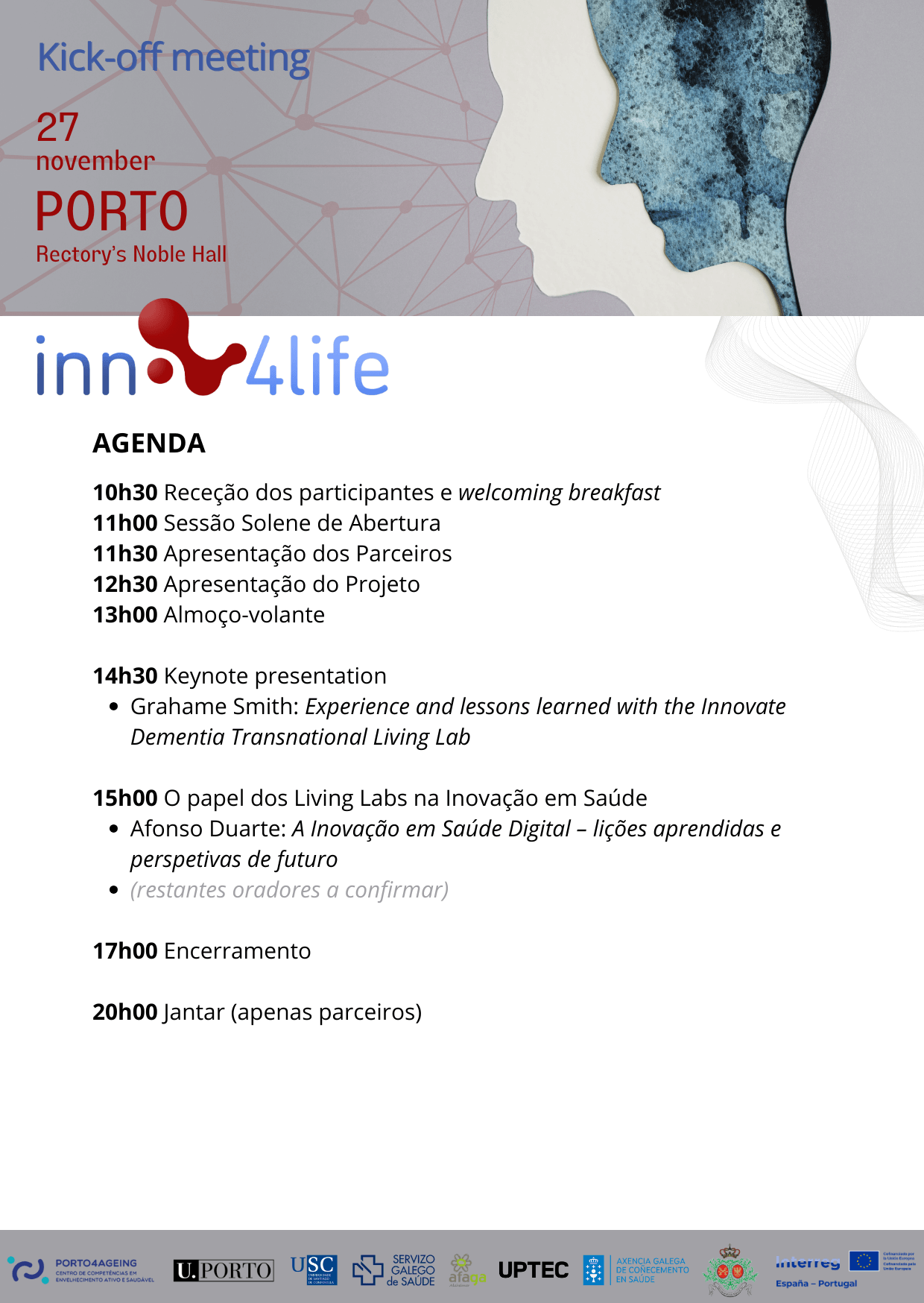 The launch session of the project will take place on November 27, between 10:30 am and 5:00 pm, in the Noble Hall of the Rectory of the University of Porto, at the invitation of the Competence Centre for Active and Healthy Ageing of the University of Porto (Porto4Ageing).